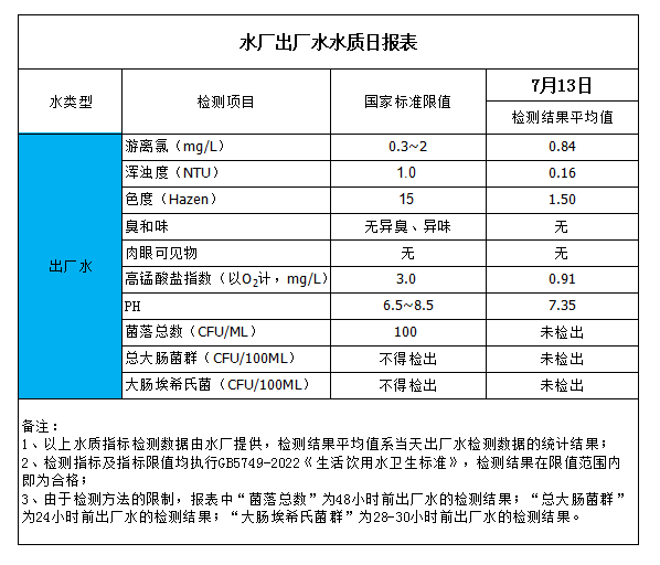 水廠出廠水水質(zhì)日?qǐng)?bào)表(2023-7-13)