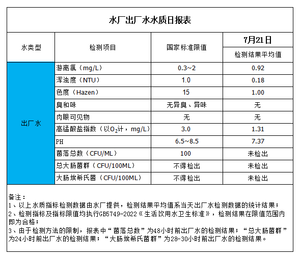 水廠出廠水水質(zhì)日?qǐng)?bào)表(2023-7-21)