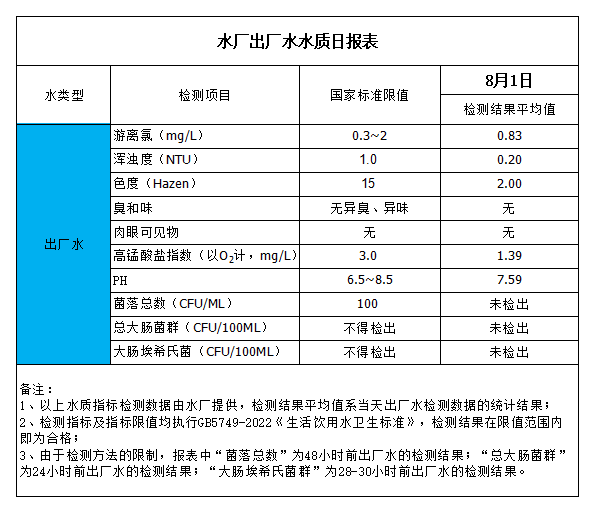 水廠出廠水水質(zhì)日?qǐng)?bào)表(2023-8-1)