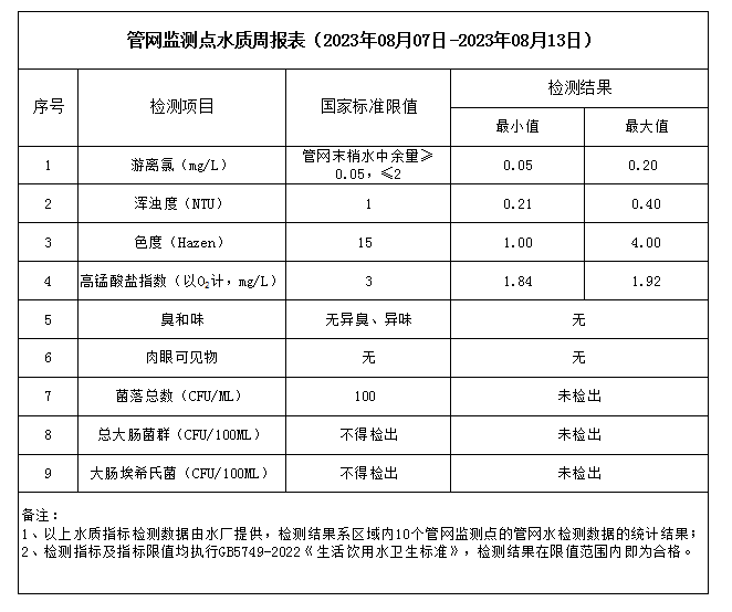 管網(wǎng)監(jiān)測點水質(zhì)周報表(2023年08月07日-2023年08月13日)