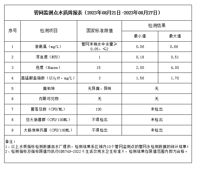管網(wǎng)監(jiān)測點水質周報表(2023年08月21日-2023年08月27日)