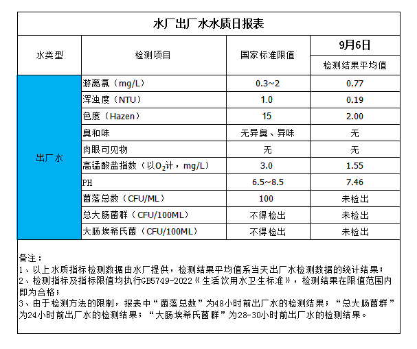 水廠出廠水水質(zhì)日報(bào)表(2023-9-6)