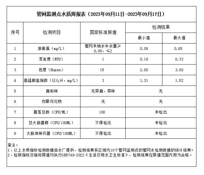 管網(wǎng)監(jiān)測(cè)點(diǎn)水質(zhì)周報(bào)表(2023年09月11日-2023年09月17日)