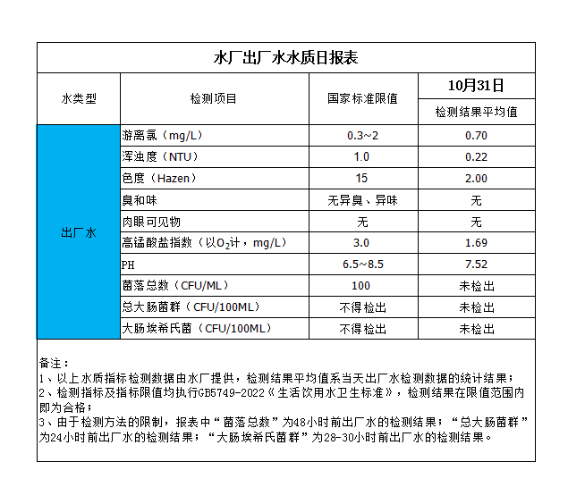水廠出廠水水質(zhì)日?qǐng)?bào)表(2023-10-31)