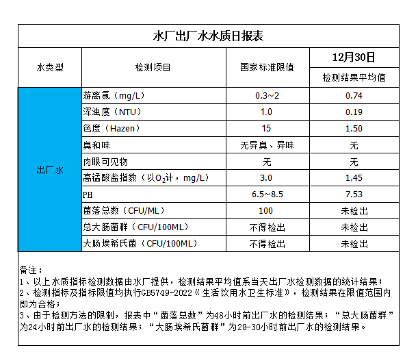 水廠出廠水水質(zhì)日?qǐng)?bào)表(2023-12-30)