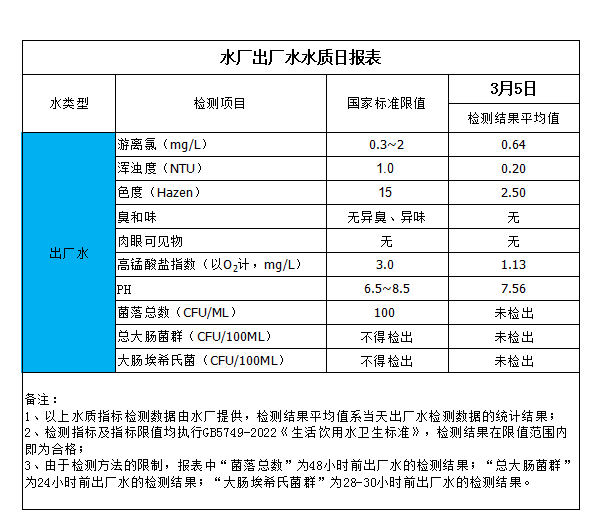 水廠(chǎng)出廠(chǎng)水水質(zhì)日?qǐng)?bào)表(2024-3-5)