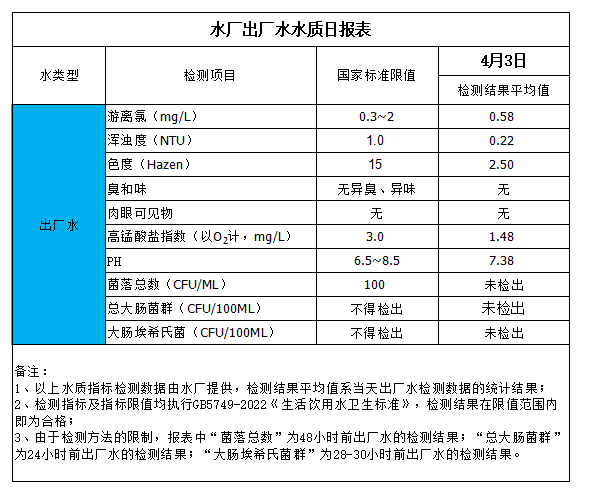 水廠出廠水水質(zhì)日?qǐng)?bào)表(2024-4-3)