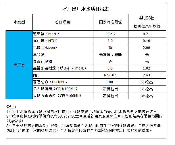 水廠出廠水水質(zhì)日報(bào)表(2024-4-28)