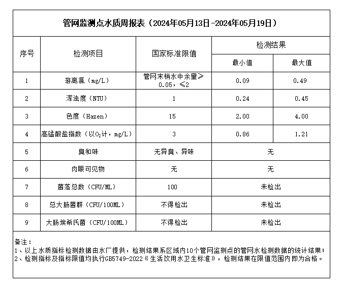 管網(wǎng)監(jiān)測點水質(zhì)周報表(2024年05月13日-2024年05月19日)