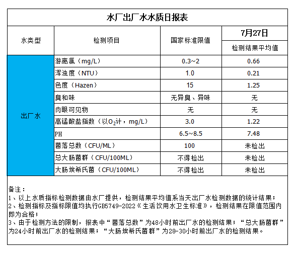 水廠出廠水水質(zhì)日報表(2024-7-27)