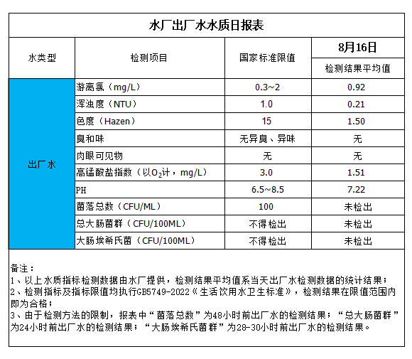 水廠出廠水水質(zhì)日報表(2024-8-16)
