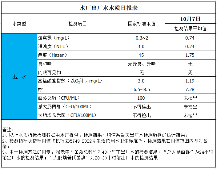 水廠出廠水水質(zhì)日?qǐng)?bào)表(2024-10-7)